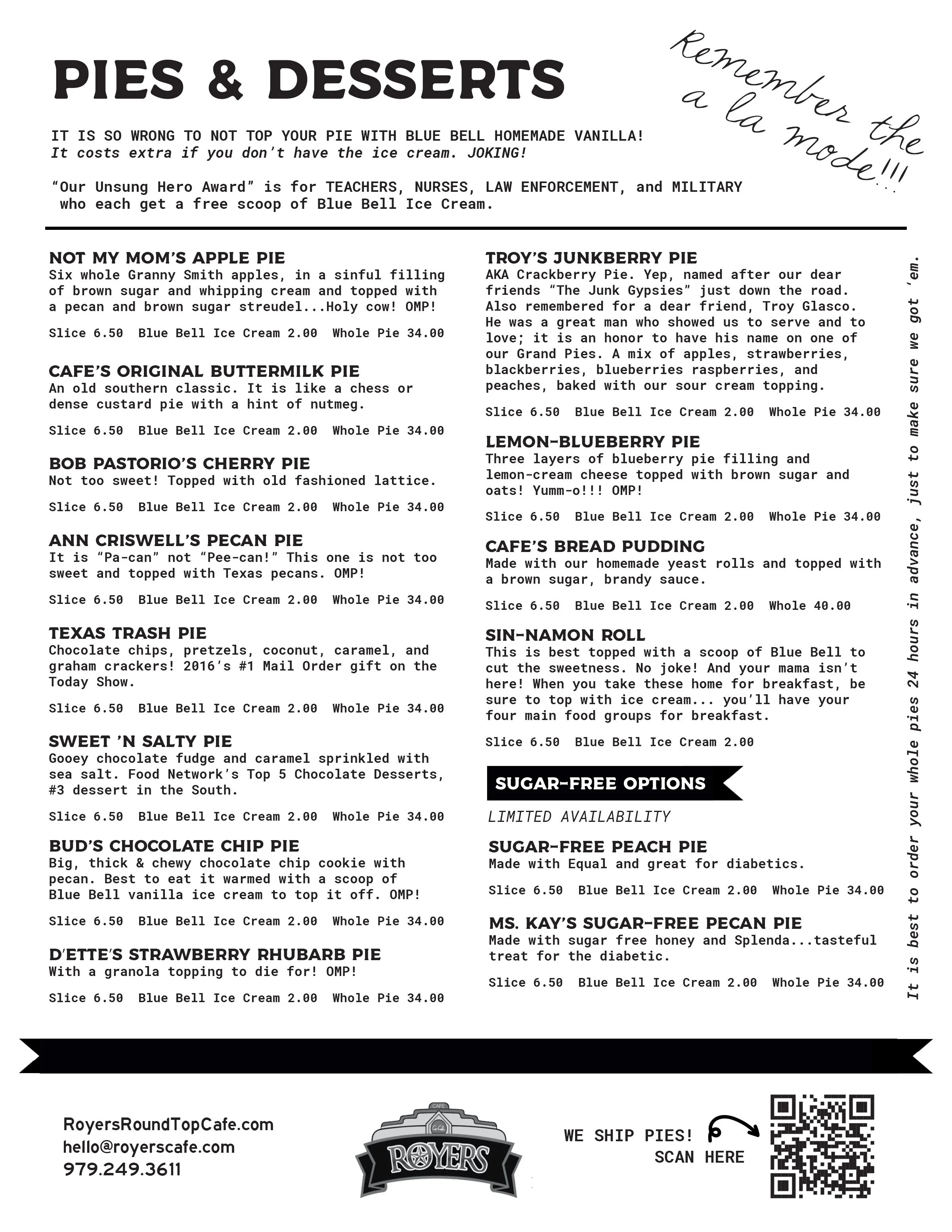 Lunch Menu.Antique Show 2025 Menu LUNCH MENU PDF HERE Can’t make it to the cafe? Ship Royers Pies and Savory Food to your home or business with ease, via Goldbelly. Shop Now